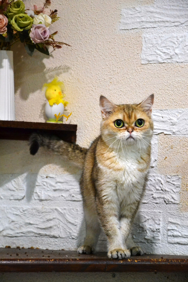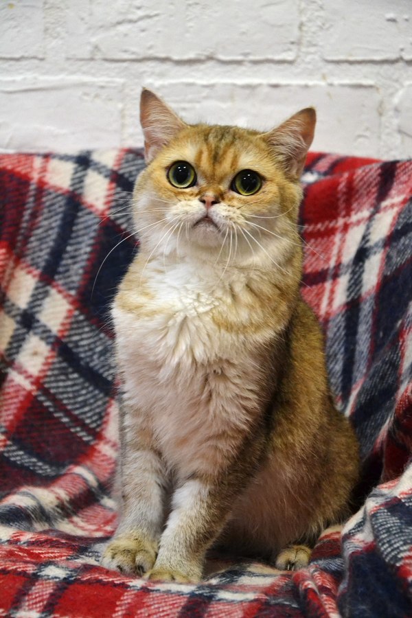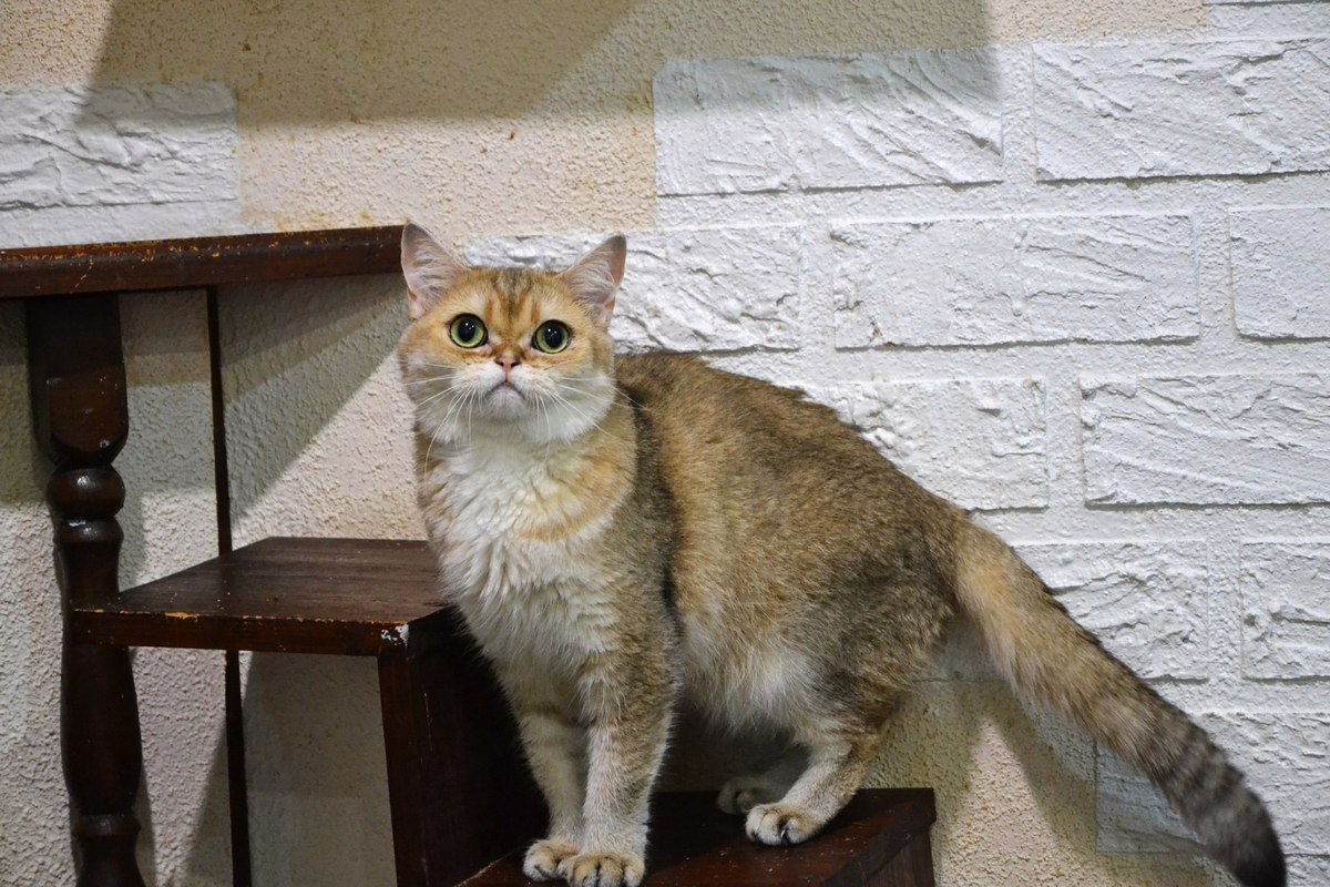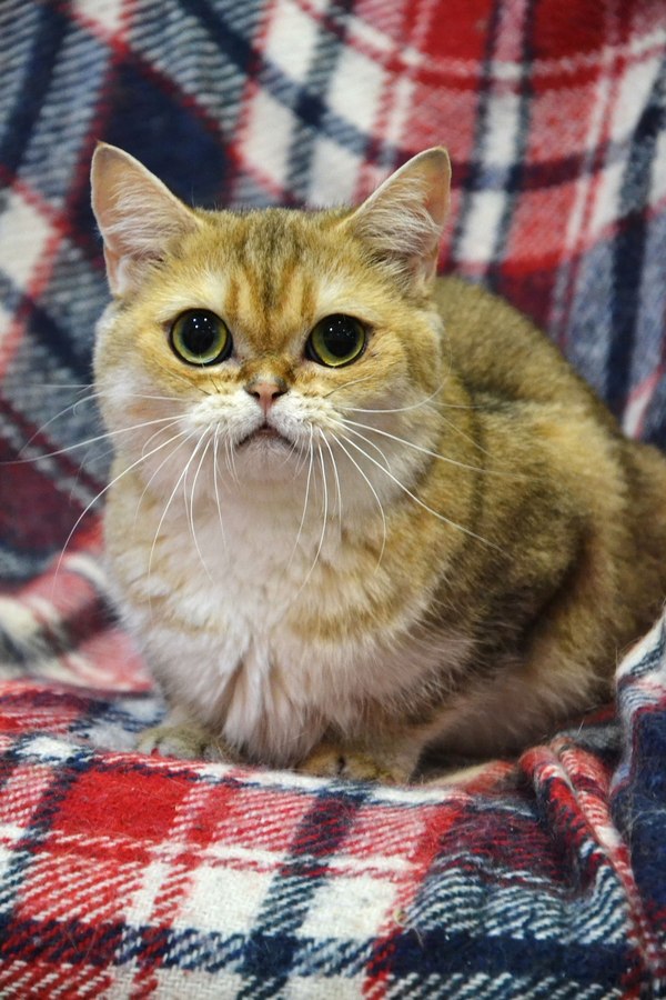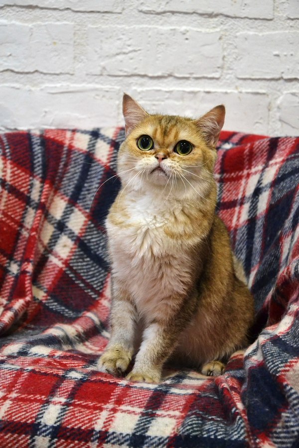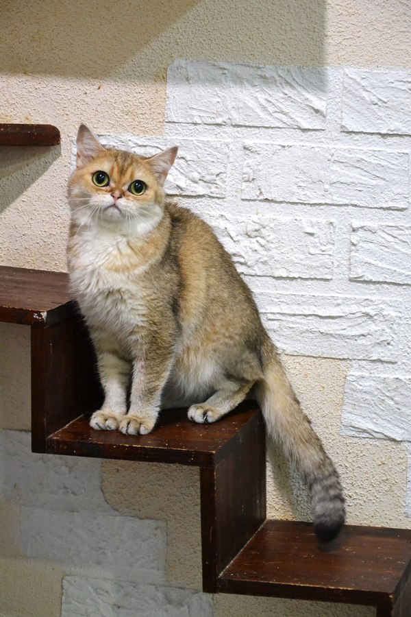 Юппи — грациозная шотландская прямоухая кошка с красивым чёрным золотым тиккированным окрасом. Её шерсть искрится на свету мягкими переливами, а выразительные зелёные глаза светятся любопытством и озорством.
