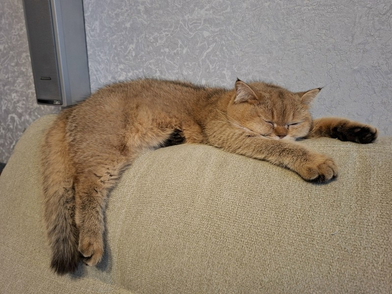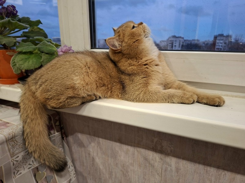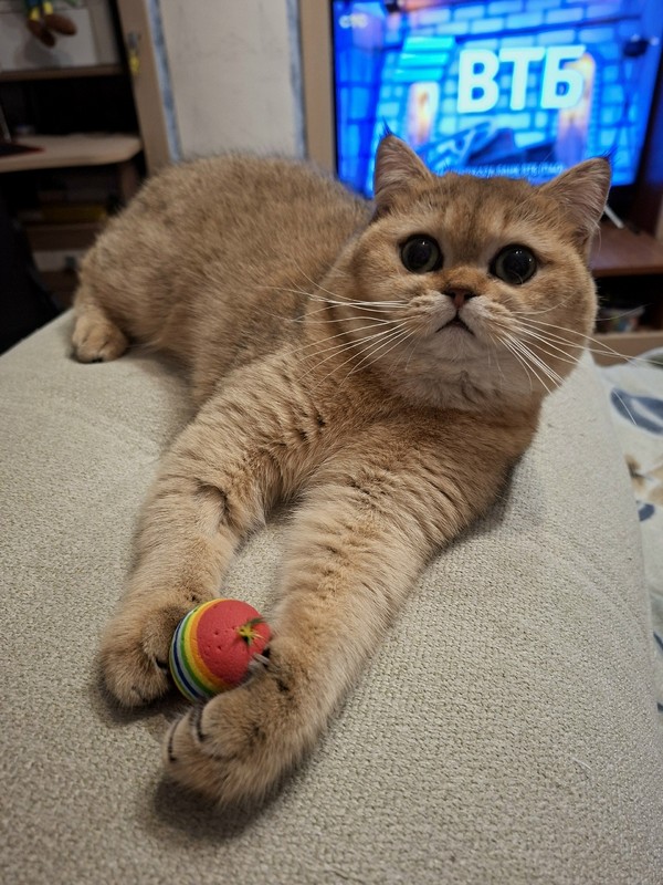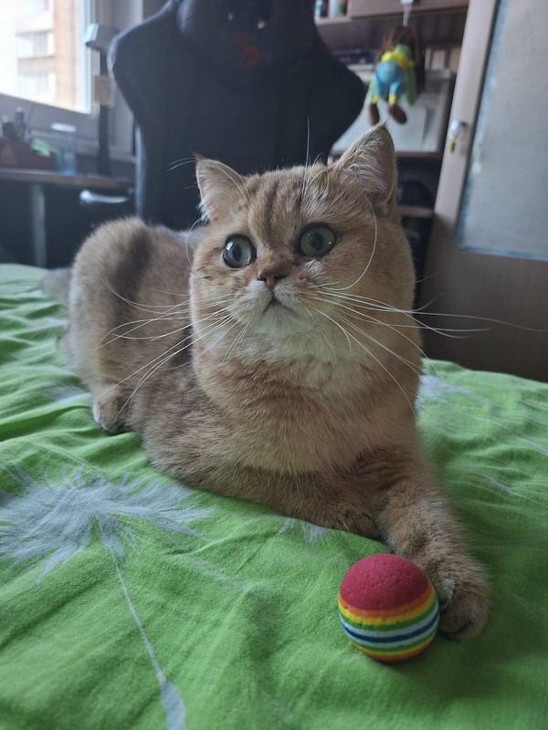 У него на спинке и хвосте проявилась чёрная полоска. Дед Мороз принёс ему кошачий домик, но Лу сидит пока только на крыше. Купили робот-пылесос для него катался на нём только 1 раз. У нас всё по графику: утром и вечером игры, днём сладкий сон. Всё время осваивает что-то новое. Спасибо за нашего малыша!